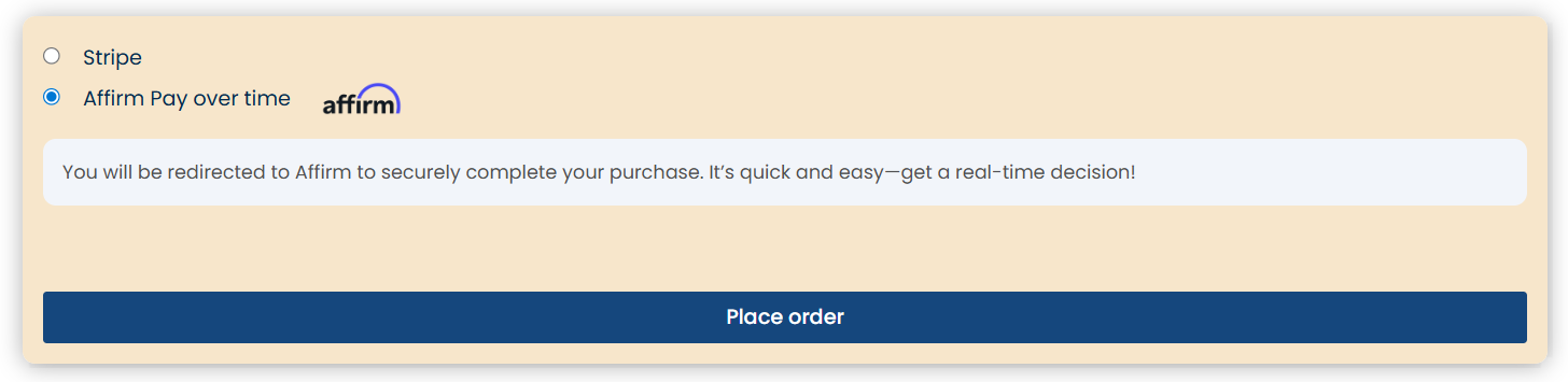 After entering your personal details, select Affirm and click Place Order to be directed to the Affirm checkout process. Enter a few pieces of info for a real-time decision and review your payment options.